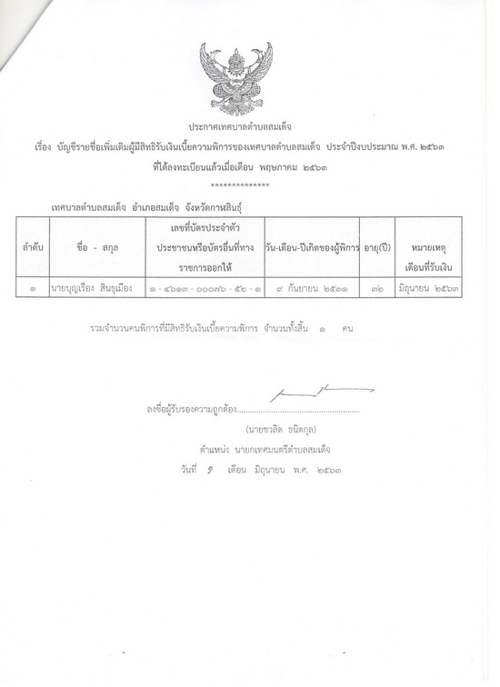 ประกาศรายชื่อผู้มีสิทธิ์รับเงินเบี้ยความพิการ เทศบาลตำบลสมเด็จ ประจำปี 2563 ที่มาลงทะเบียนประจำเดือนพฤษภาคม 2563