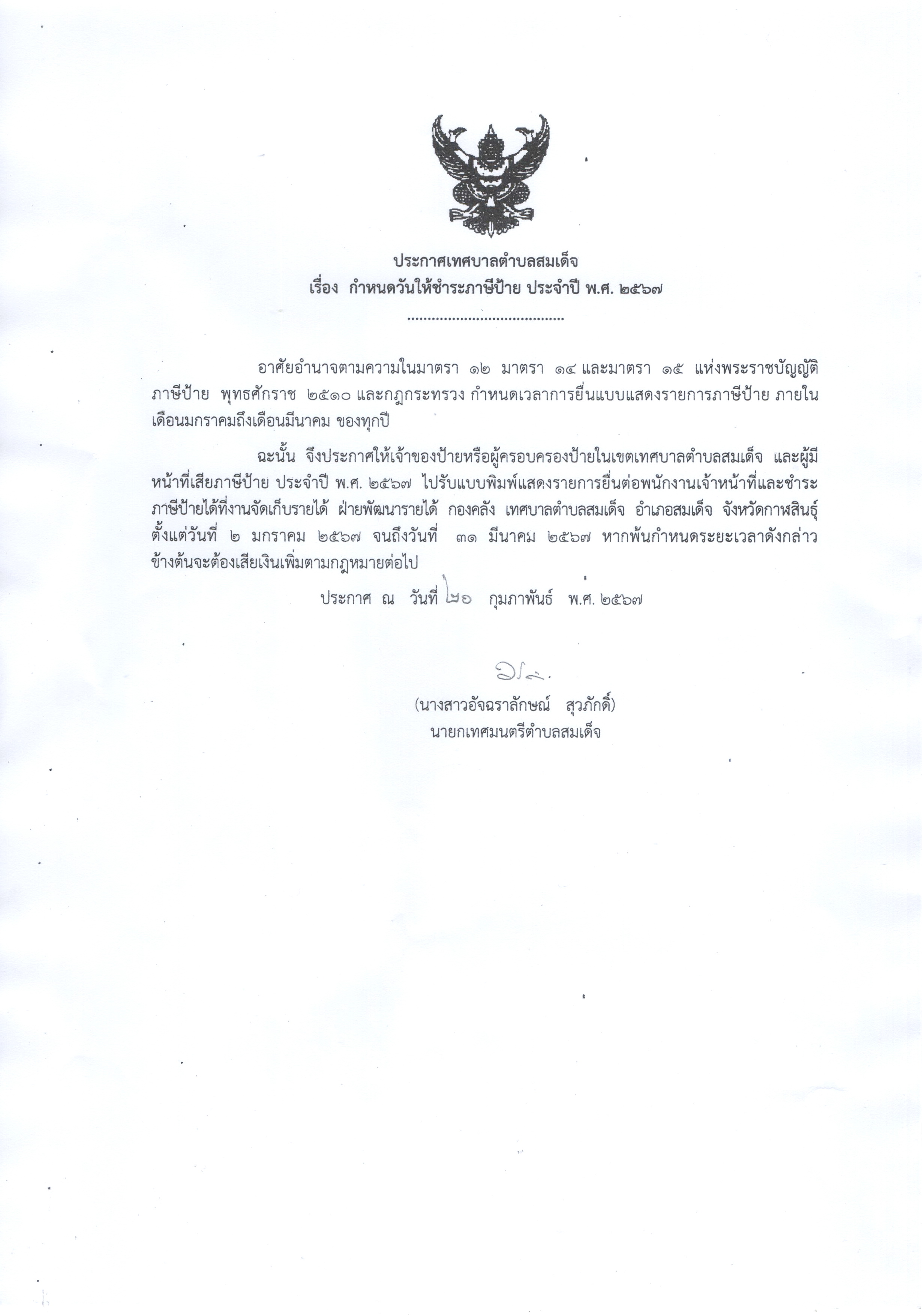 ประกาศเทศบาลตำบลสมเด็จ เรื่อง กำหนดวันให้ชำระภาษีป้าย ประจำปี พ.ศ.2567