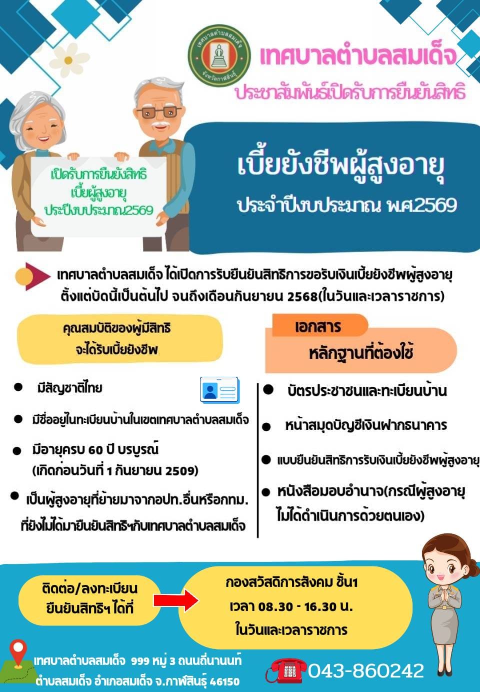 ประกาศเทศบาลตำบลสมเด็จ เรื่อง การยืนยันสิทธิขอรับเงินเบี้ยยังชีพผู้สูงอายุประจำปีงบประมาณ พ.ศ. 2569