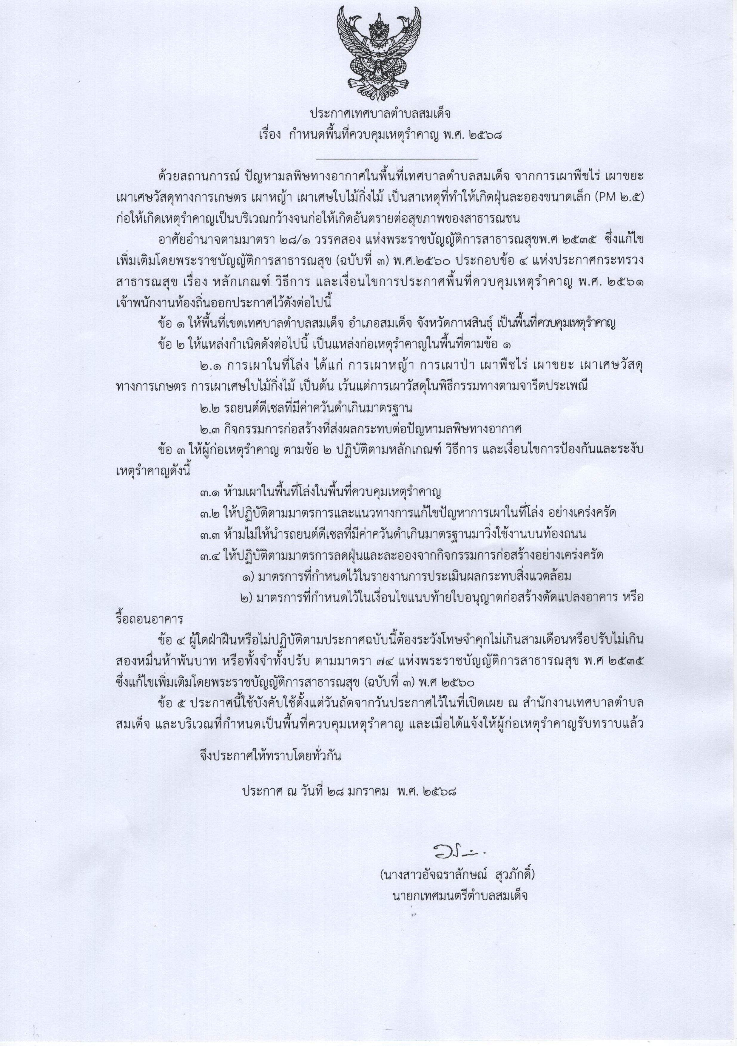ประกาศเทศบาลตำบลสมเด็จ เรื่อง กำหนดพื้นที่ควบคุมเหตุรำคาญ พ.ศ.2568