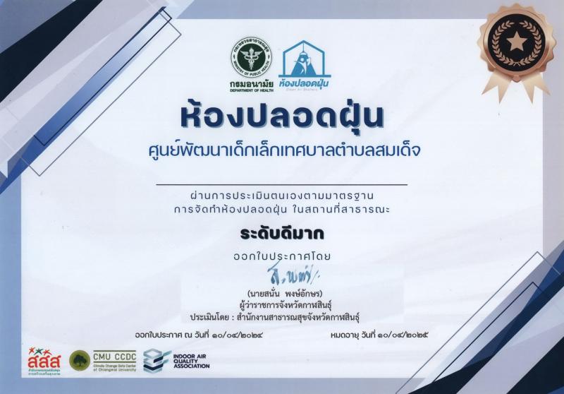 เทศบาลตำบลสมเด็จ เข้ารับเกียรติบัตร “ห้องปลอดฝุ่น” ศูนย์พัฒนาเด็กเล็กเทศบาลตำบลสมเด็จ ผ่านการประเมินตนเองตามมาตรฐานการจัดทำห้องปลอดฝุ่น ในสถานที่สาธารณะ ระดับดีมาก