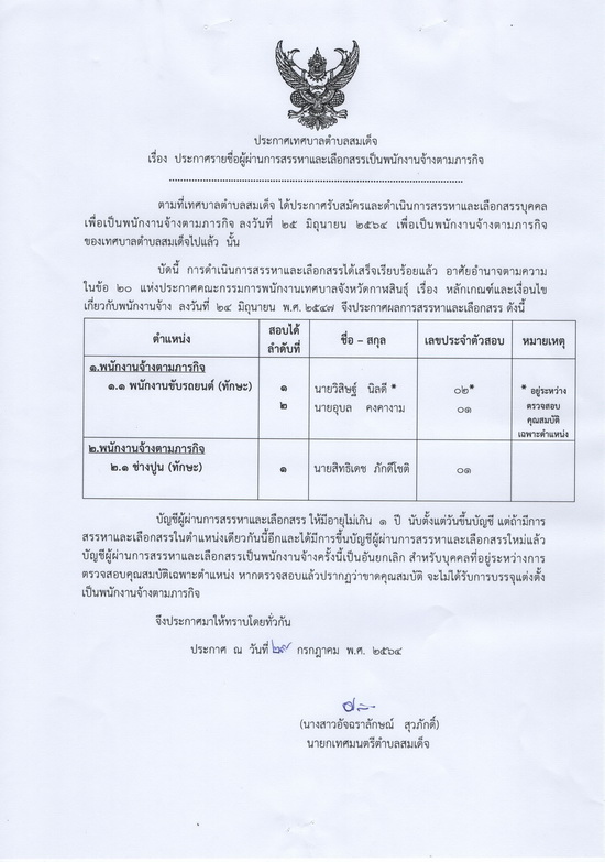 ประกาศรายชื่อผู้ผ่านการสรรหาและเลือกสรรเป็นพนักงานจ้างตามภารกิจ
