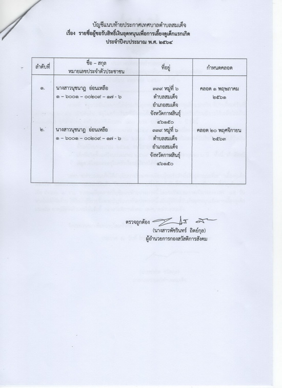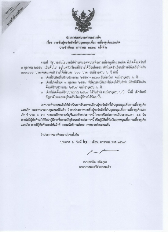 ประกาศรายชื่อผู้ขอรับสิทธิ์เงินอุดหนุนเพื่อการเลี้ยงดูเด็กแรกเกิดประจำเดือนมกราคม พ.ศ.2564 ครั้งที่ 2