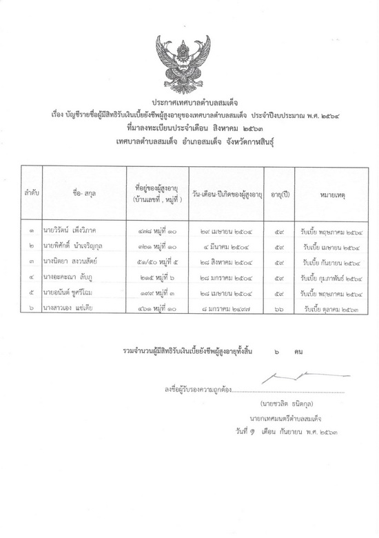 ประกาศรายชื่อผู้มีสิทธิ์รับเงินเบี้ยยังชีพผู้สูงอายุ เทศบาลตำบลสมเด็จ ประจำปี 2564 ที่มาลงทะเบียนประจำเดือนสิงหาคม 2563