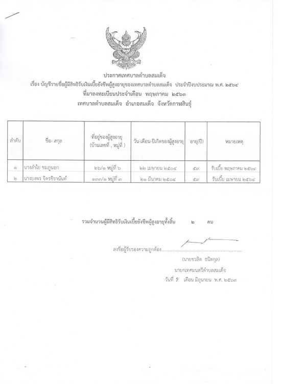 ประกาศรายชื่อผู้มีสิทธิ์รับเงินเบี้ยยังชีพผู้สูงอายุ เทศบาลตำบลสมเด็จ ประจำปี 2564 ที่มาลงทะเบียนประจำเดือนพฤษภาคม 2563
