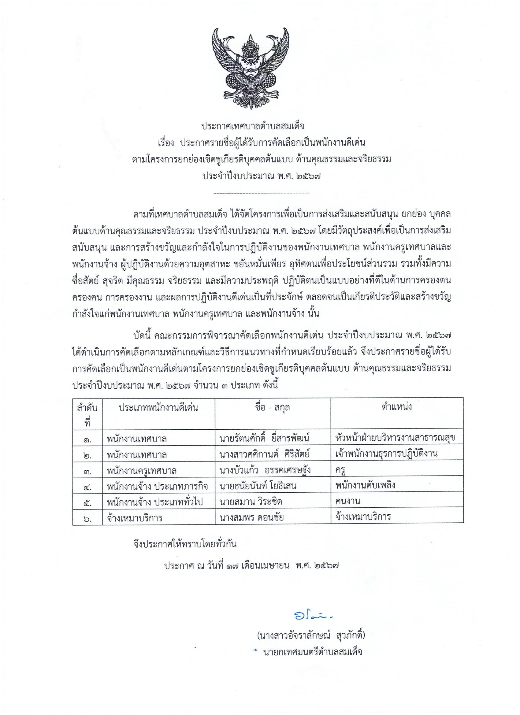 ชื่อเรื่อง : ประกาศเทศบาลตำบลสมเด็จ เรื่องประกาศรายชื่อผู้ได้รับการคัดเลือกเป็นพนักงานดีเด่น ตามโครงการยกย่องเชิดชูเกียรติ บุคคลต้นแบบด้านคุณธรรม จริยธรรม ประจำปีงบประมาณ พ.ศ.2567